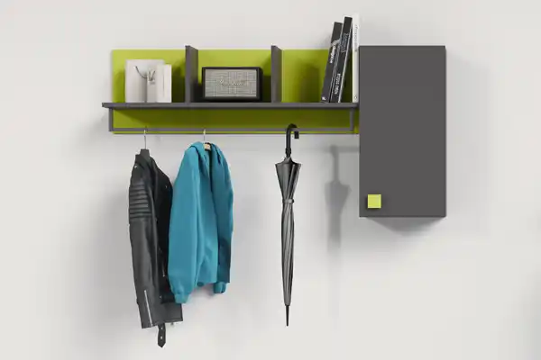 La scommessa è interpretare lo stile dei ragazzi tra tendenze e una visione personale del loro carattere. Una sfida vinta con tante soluzioni a parete, fissate in modo semplice, con un grande effetto scenico. In questa soluzione per esempio, alle mensole sono affiancati appendiabiti, box sospesi con ante o a giorno.