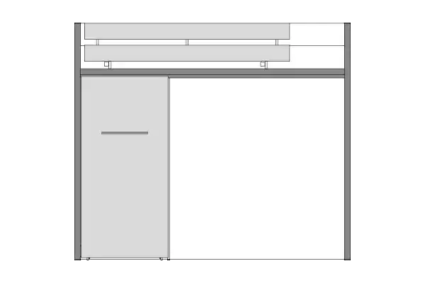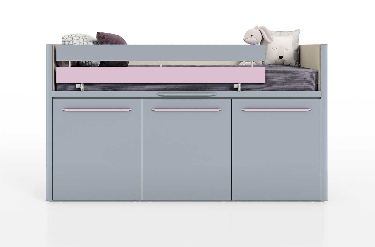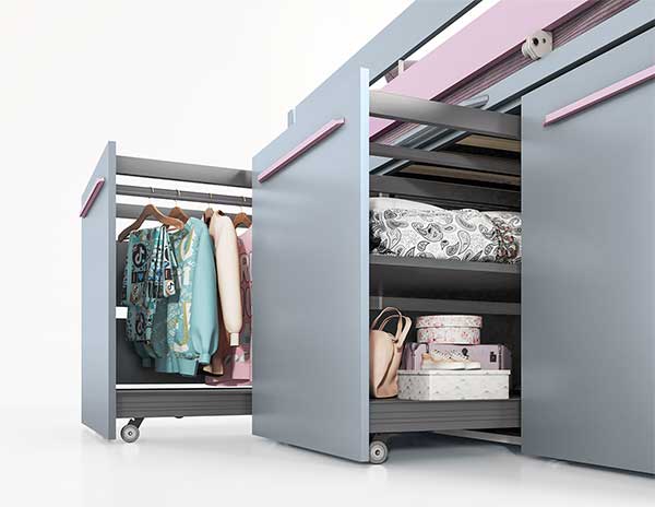 Il salvaspazio innovativo, pratico e conveniente. Letto con sottostanti contenitori estraibili e scrivanie estraibile con struttura in alluminio. Nella versione H. 116 il tutto montato su ruote, quindi spostabile. Materasso 200 x 90.