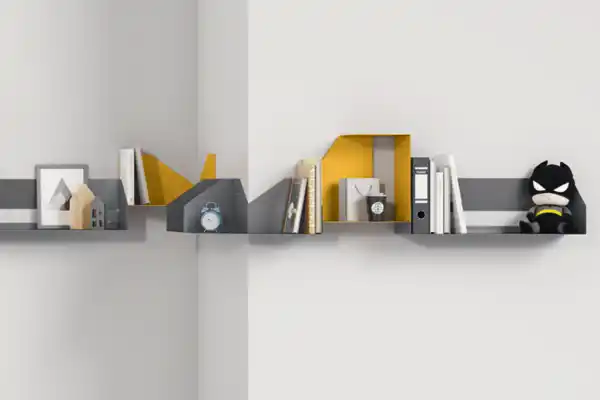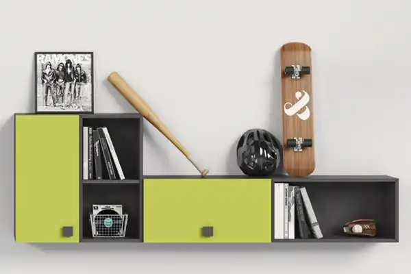 La scommessa è interpretare lo stile dei ragazzi tra tendenze e una visione personale del loro carattere. Una sfida vinta con tante soluzioni a parete, fissate in modo semplice, con un grande effetto scenico. In questa soluzione per esempio, alle mensole sono affiancati appendiabiti, box sospesi con ante o a giorno.